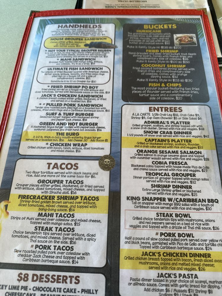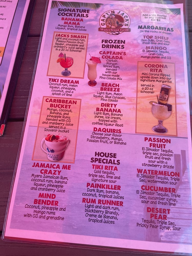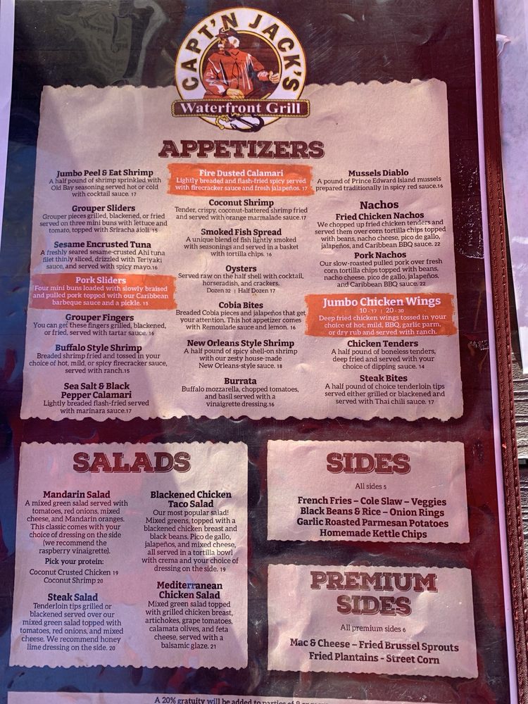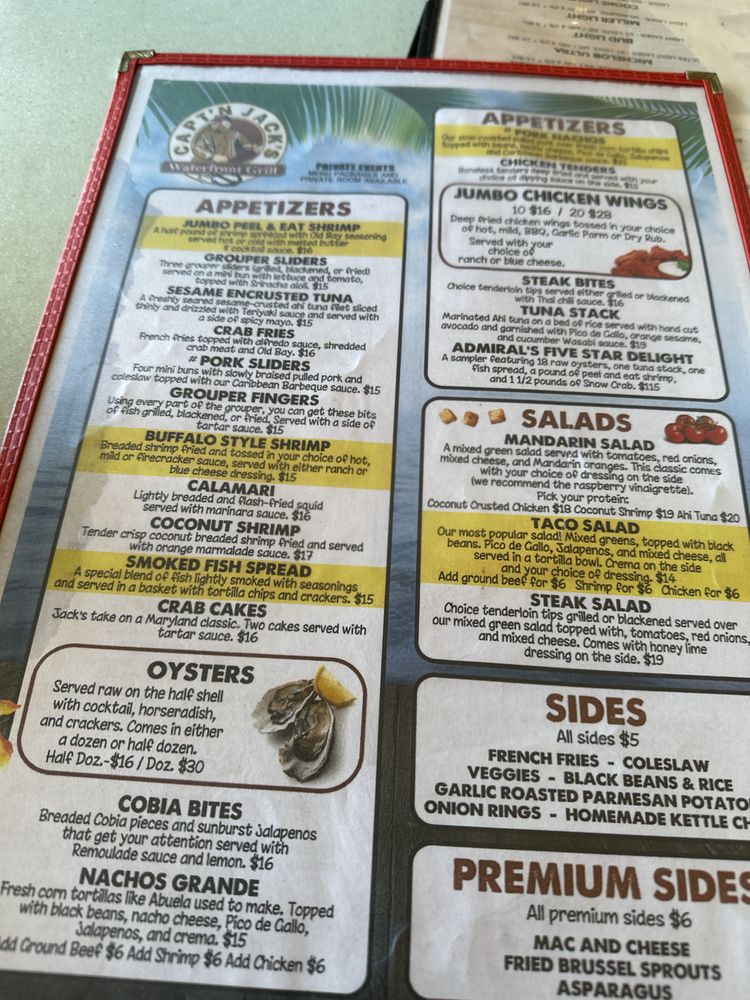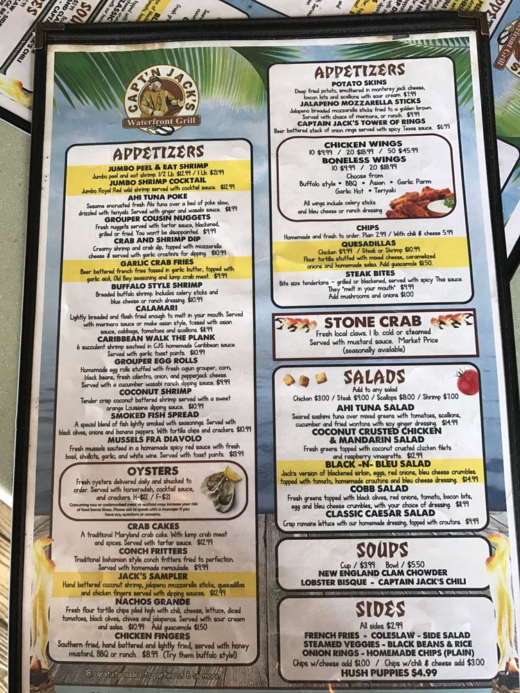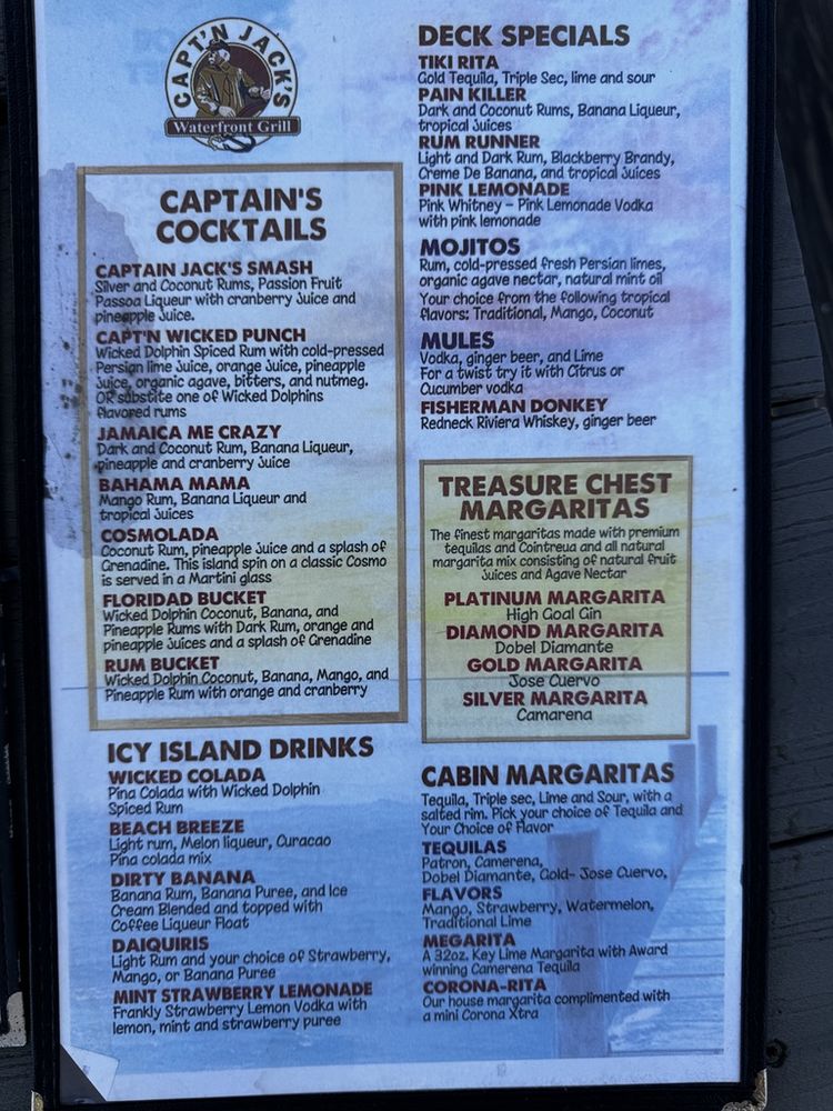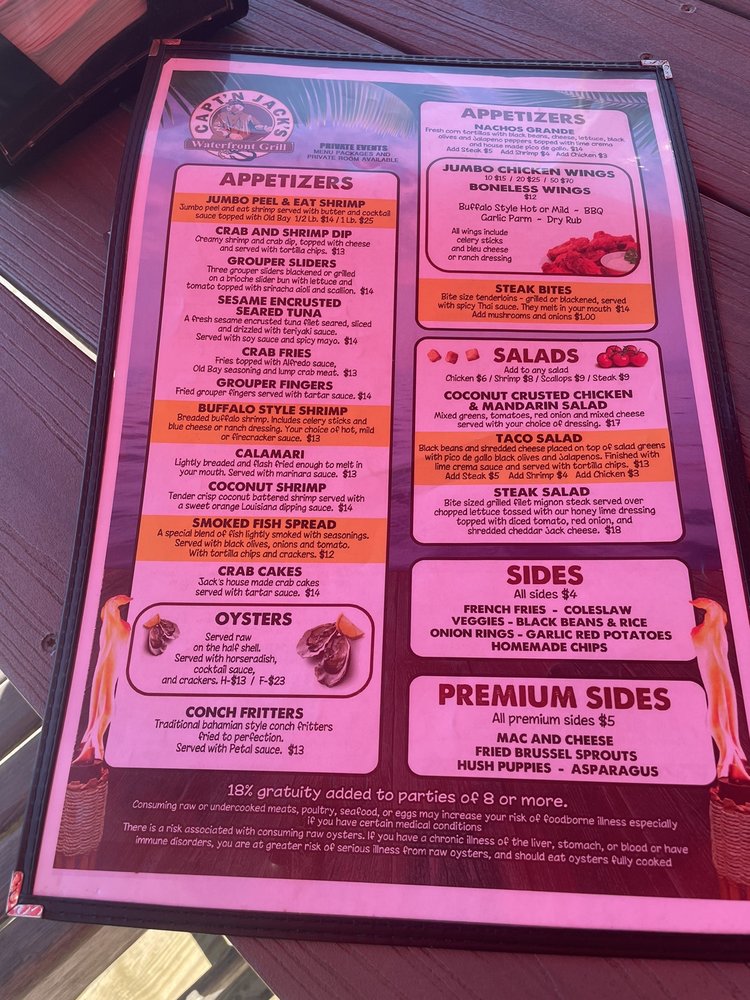 Capt'n Jack's Waterfront Grille is a seafood and American cuisine restaurant located in Tarpon Springs, FL. This waterfront eatery offers a variety of dishes, including the popular Blackened Chicken Taco Salad and Buffalo Style Shrimp appetizer. The menu also features Fried Chicken Nachos and Pork Nachos for a flavorful snacking experience. Customers have praised the fresh seafood, attentive service, and scenic views at Capt'n Jack's. The establishment provides many amenities such as outdoor seating, live music, and a full bar, making it a great spot for lunch, dinner, or happy hour. With a casual ambiance and a range of vegetarian options, Capt'n Jack's Waterfront Grille is a must-visit for seafood lovers looking for a delicious dining experience.